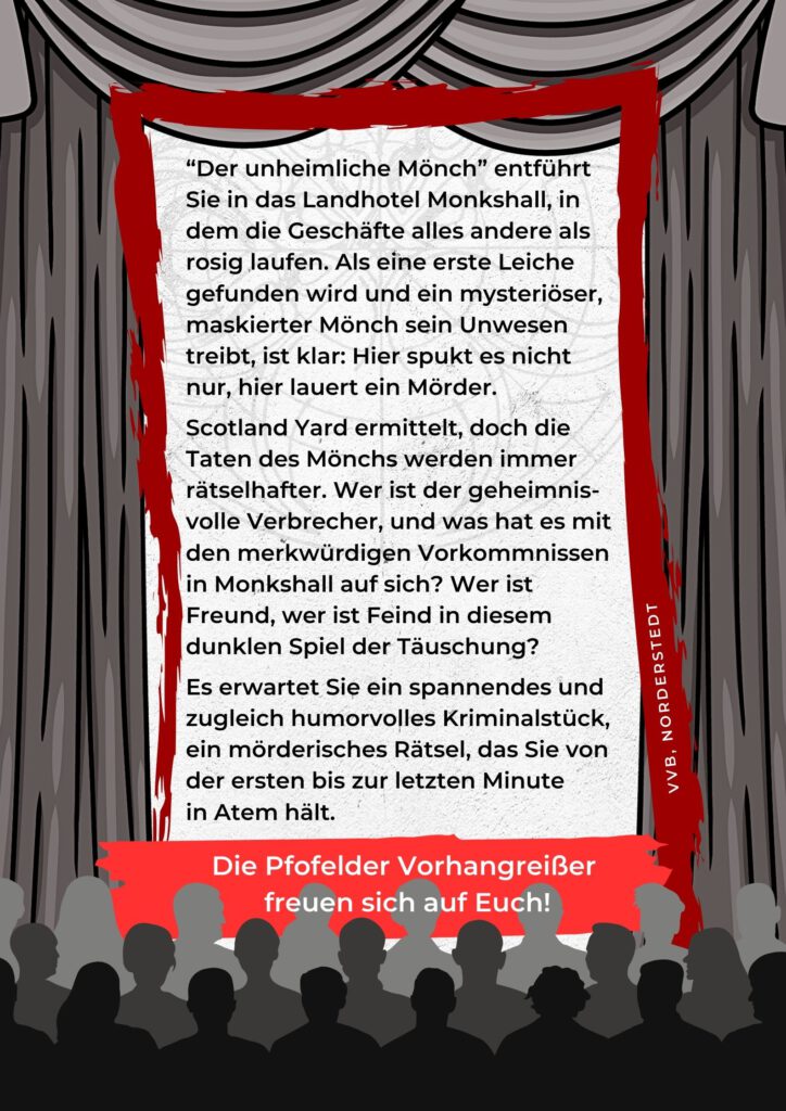 Wer verbirgt sich hinter der Mönchskutte? Was ist sein Motiv und wer wird das nächste Opfer sein? Die Schauspieler der Vorhangreißer sind schon jetzt mit Feuereifer dabei, diese schaurige Geschichte um Rätsel, Mord und überraschende Wendungen auf die Bühne zu bringen.